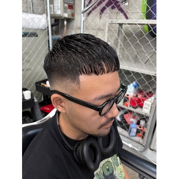 0ミリ~のスキンフェードで、トップは短めにして前髪を揃えた、クロップスタイルです。